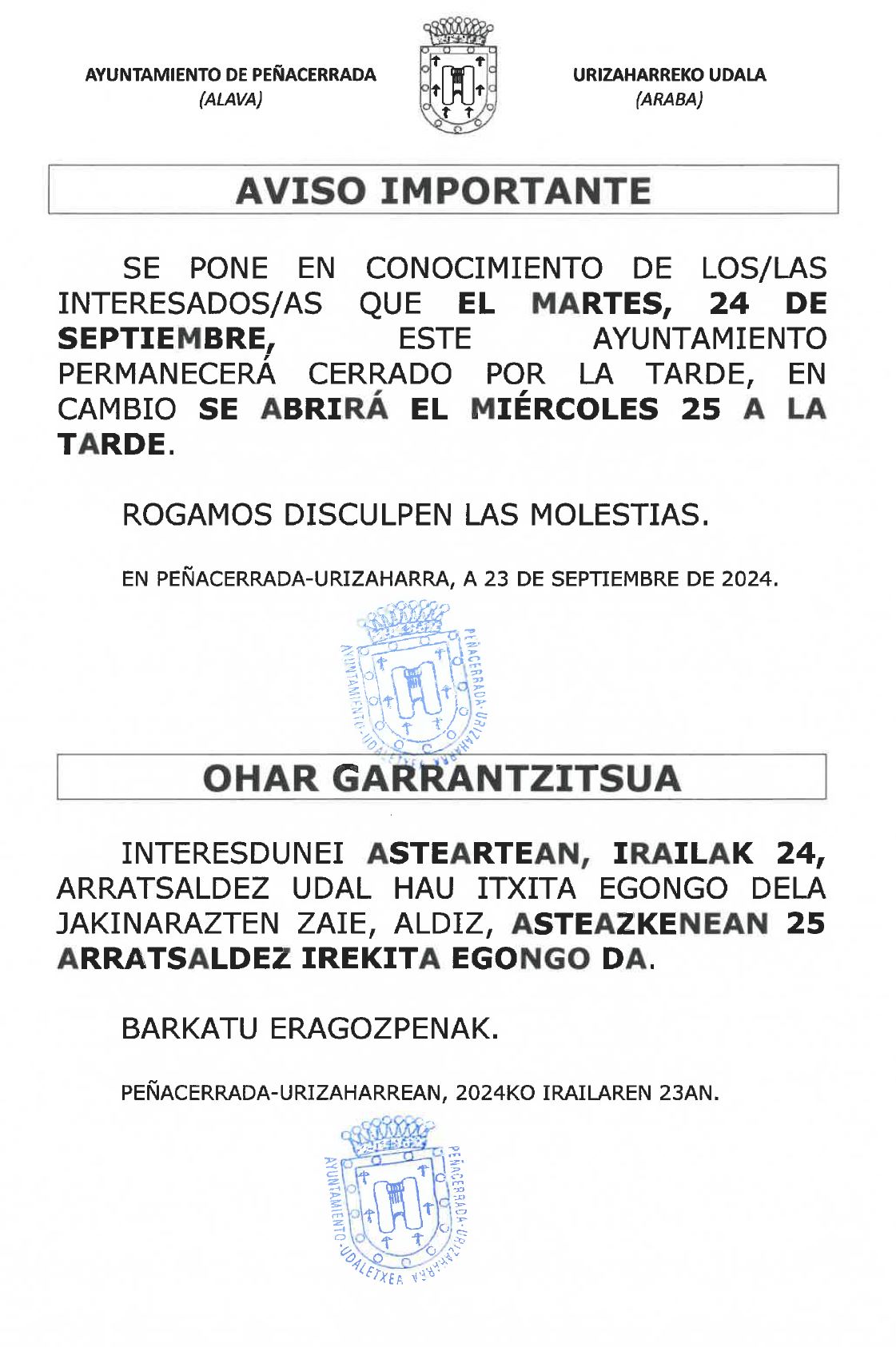 Irailak 24, asteartea Udala arratsaldez itxita